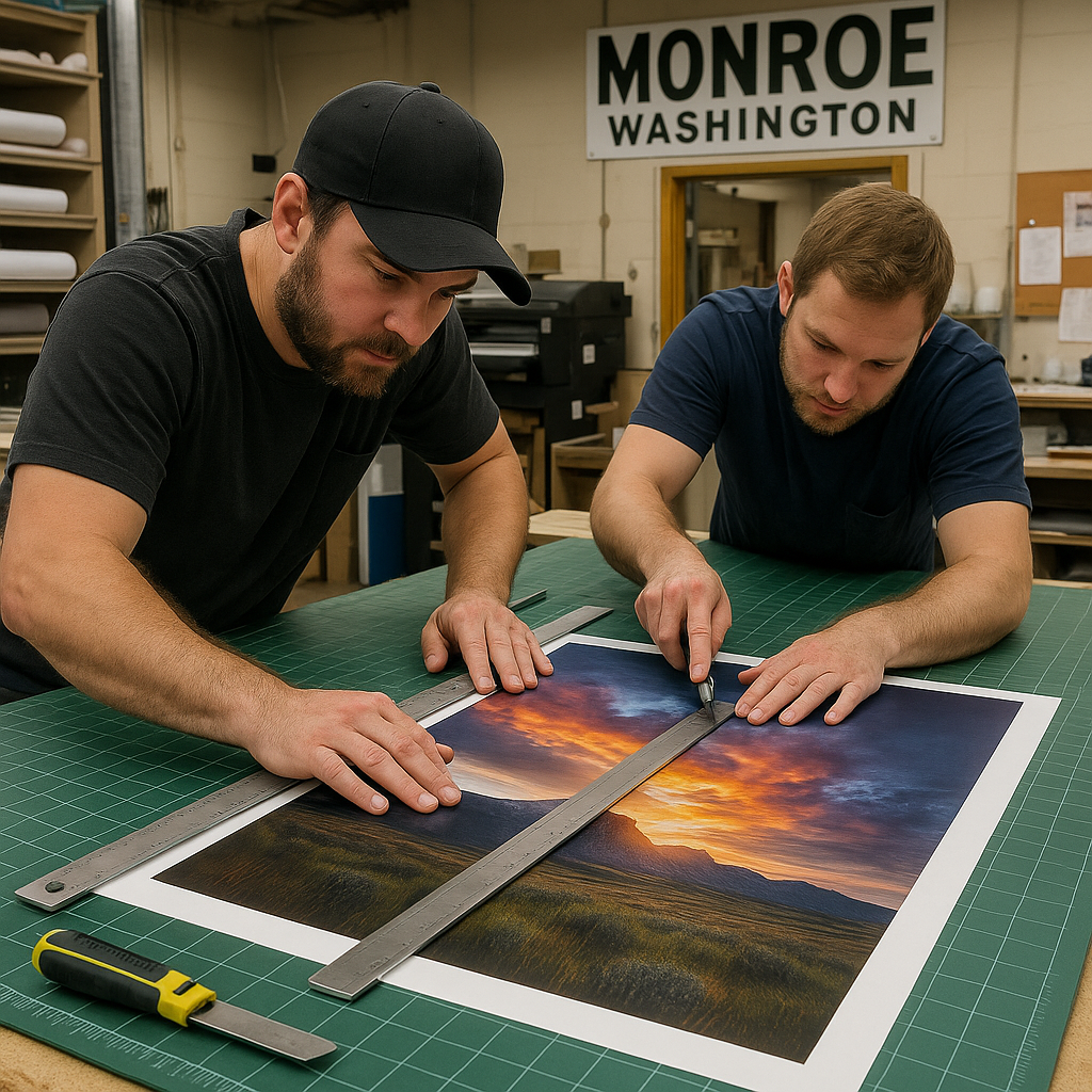 Below are just a few of the walk-in projects we help Monroe businesses with. If you have artwork in mind, bring it—if it fits inside our presses or finishing tables, we can usually turn it the same day.