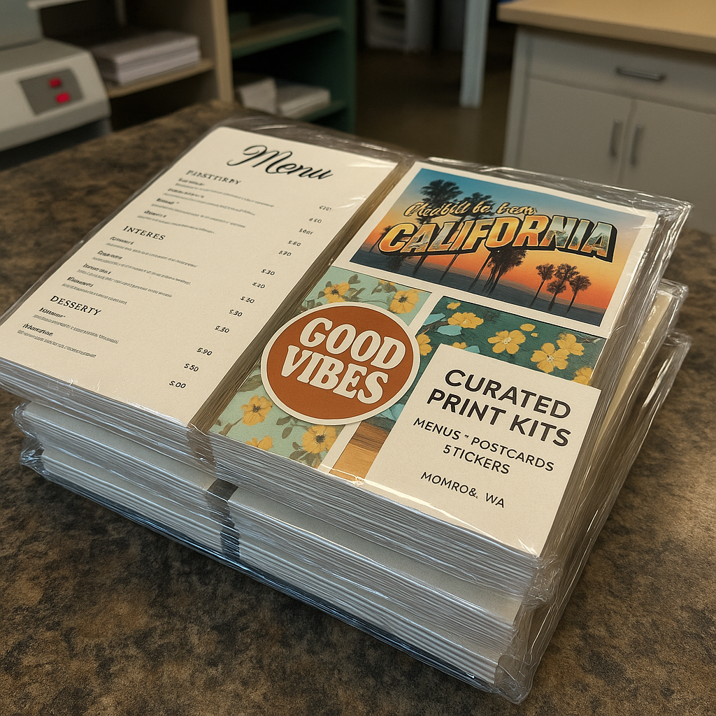 Menus, postcards, stickers, and booklets packaged together for franchise rollouts or trade shows so your team can grab once and go.