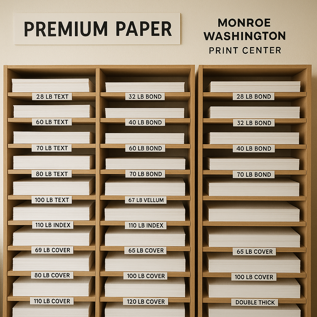 We keep premium stocks in-house so we can reprint proofs quickly and finish projects without shipping delays. Bring samples if you need color-matching—we can usually match Pantone or coated swatches on the spot.